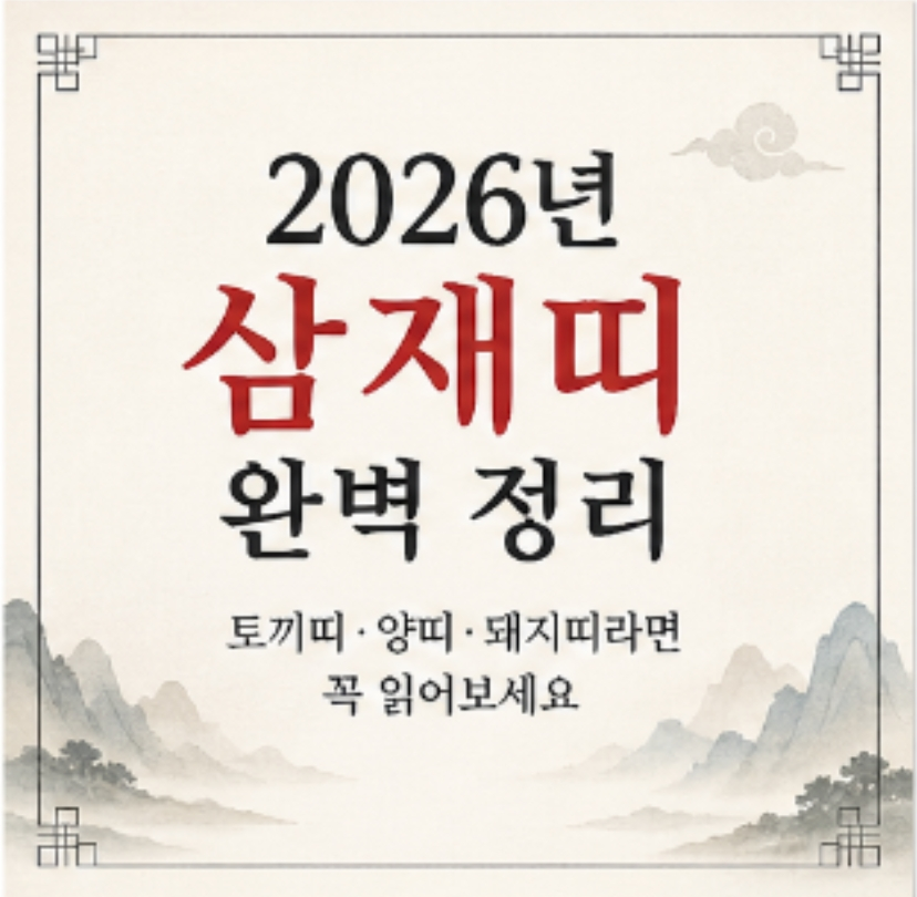 2026년 삼재띠 완벽 정리 | 토끼띠·양띠·돼지띠라면 꼭 읽어보세요 연말이 되면 꼭 한 번씩 찾아보게 되는 게 있잖아요."나 혹시 내년에 삼재 아니야?" 하고 괜히 불안해지는 그거요.저도 매년 한 번씩은 검색하게 되더라고요.. ㅋㅋ그래서 이번엔 2026년 삼재띠가 뭔지, 어떤 의미인지,그리고 삼재라는 말에 지레 겁먹지 않아도 되는 이유까지한 번에 싹 정리해봤어요.2026년 삼재띠, 결론부터2026년 삼재띠는 토끼띠, 양띠, 돼지띠예요.이 세 띠는 지지(地支)로 '해묘미(亥卯未)' 삼합에 속하는데,사오미(巳午未) 해인 을사년(2025)·병오년(2026)·정미년(2027), 딱 이 3년이 삼재 기간이에요.삼재 구분연도의미들삼재2025년 (을사년)삼재가 들어오는 시작의 해눌삼재2026년 (병오년)삼재가 머무..