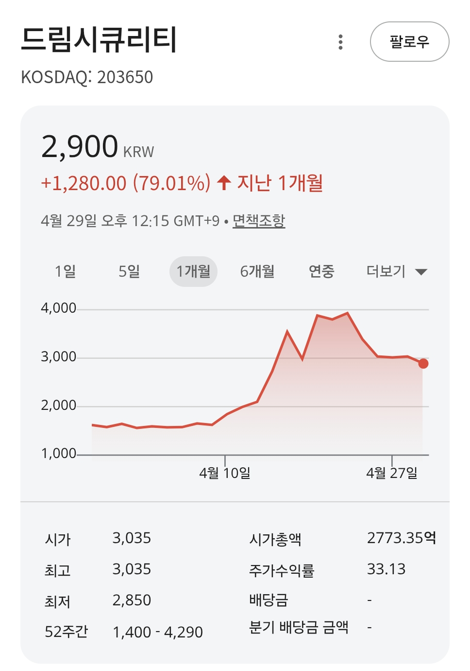 드림시큐리티 주가 79% 급등! 2,900원 눌림목일까 고점일까?최근 보안 섹터의 움직임이 심상치 않습니다. 특히 드림시큐리티(KOSDAQ: 203650)는 한 달 사이 무려 79%나 급등하며 많은 투자자의 시선을 사로잡았는데요. 오늘은 제가 직접 캡처한 주가 차트를 바탕으로 현재의 위치와 향후 전망을 분석해 보겠습니다.1. 79.01% 급등의 원인과 현재 주가 위치드림시큐리티는 지난 한 달간 1,280원이 오르며 가파른 상승 곡선을 그렸습니다. 4월 20일경 최고점인 4,290원을 찍은 뒤 현재는 2,900원 부근까지 내려와 숨 고르기를 하는 모습입니다.양자암호 및 디지털 보안 테마: 보안 이슈가 불거질 때마다 대장주 역할을 톡톡히 하고 있습니다.낙폭 과대 반등: 52주 최저가인 1,400원 대비 바닥..